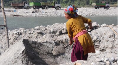 मलेखु । हातमा बेल्चा (साबेल), टाउकामा रुमाल र कम्मरमा सलको पटुकी । एकाबिहानै बालुवा सार्दै