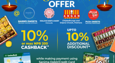 काठमाडौं । सानिमा बैंकले तिहार र छठपर्वको अवसरमा आफ्ना ग्राहकहरुका लागि विभिन्न मर्चेन्टहरुमा क्यास व्याक