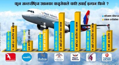 काठमाडौं । गत आर्थिक वर्षमा सर्वाधिक हवाई इन्धन खपत गर्ने अन्तर्राष्ट्रिय उडानतर्फ सरकारी स्वामित्वको नेपाल