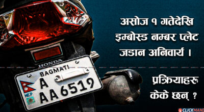 काठमाडौं । सरकारले असोज १ गतेदेखि लागु हुने गरी इम्बोस्ड नम्बर प्लेट जडान अनिवार्य गरेको