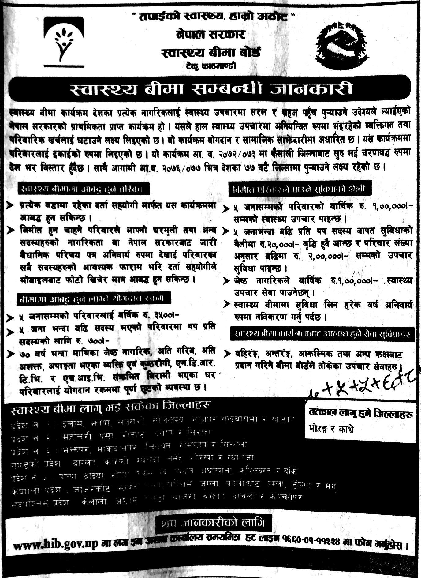 सरकारको स्वास्थ्य बीमा कार्यक्रम ७७ जिल्लामा पुर्याइने, सेवा लिन यसो गर्नुहोस