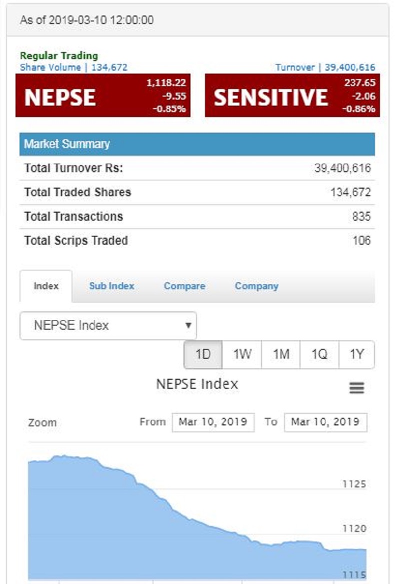 एक घन्टामै सेयर बजारमा झण्डै १० अंकको गिरावट