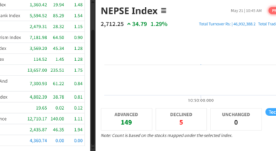 प्रिओपन सेसनमै ३४ अंकले बढ्यो नेप्से, सूचक २७०० माथि