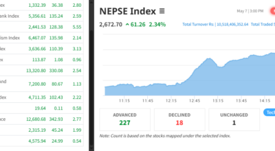६१ अंकले बढ्दै नेप्से २६७२ विन्दुमा, साढे १० अर्बको कारोबार हुँदा अधिकांश सूचक सकारात्मक
