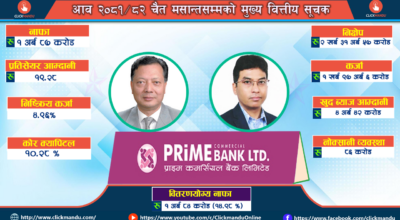 प्राइम बैंकको नाफा ६४ करोडले घट्यो, वितरणयोग्य नाफा १ अर्ब ७३ करोड