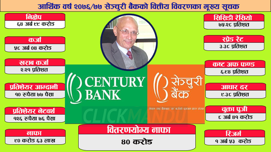 सेञ्चुरी बैंकको नाफा ३४ % ले बढ्यो, वितरणयोग्य नाफा ४० करोड बढी