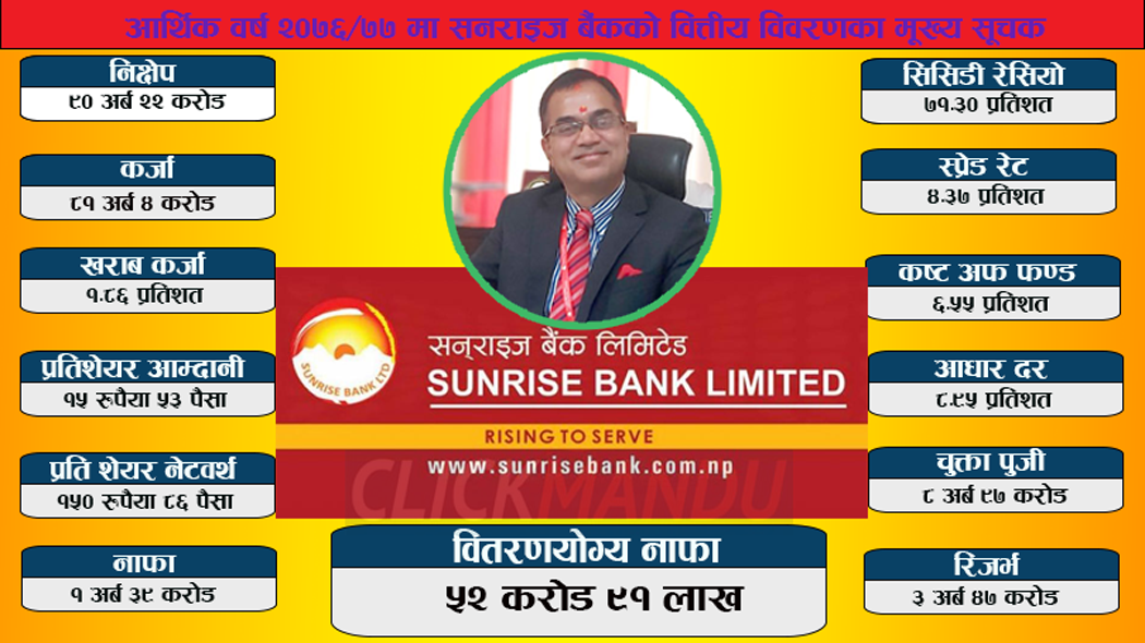 सनराइज बैंकले एक वर्षमा १५ अर्बले निक्षेप बढायो, नाफा १ अर्ब ३९ करोड