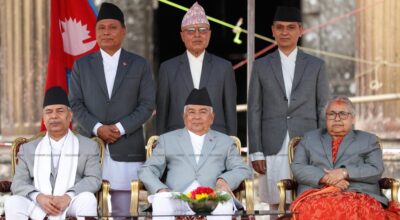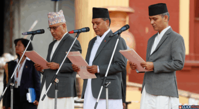 काठमाडौं । राष्ट्रपतिको कार्यालय शितल निवासमा टेन्ट टाँगेर तीन मन्त्रीको सपथ हुँदै छ । प्रधानमन्त्री